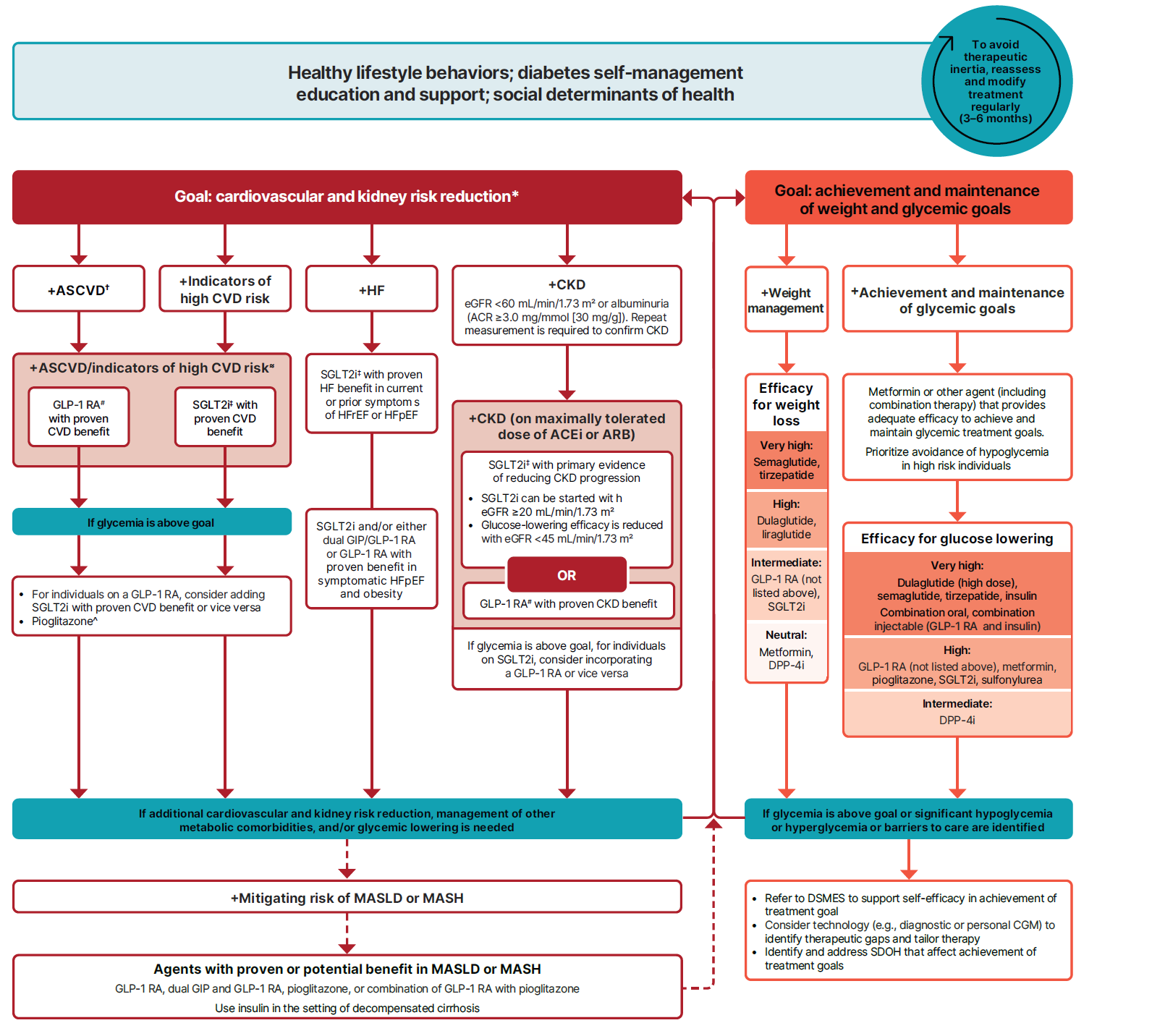- The visual highlights areas of overlap and divergence in first-line, add-on, and comorbidity-focused therapy, streamlining navigation of core ADA and AACE pharmacotherapy recommendations.