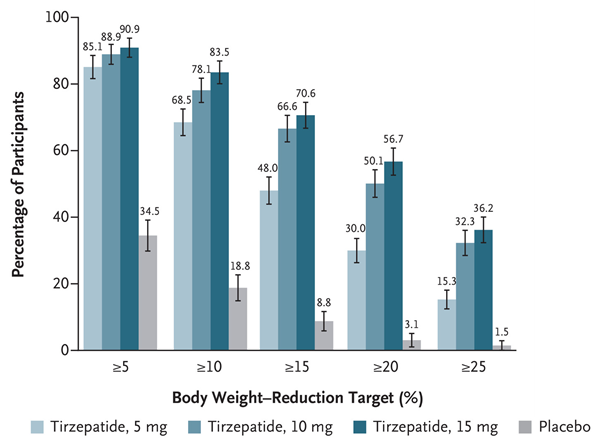 - It emphasizes dose-dependent weight loss: higher tirzepatide doses showed greater percentage reductions.