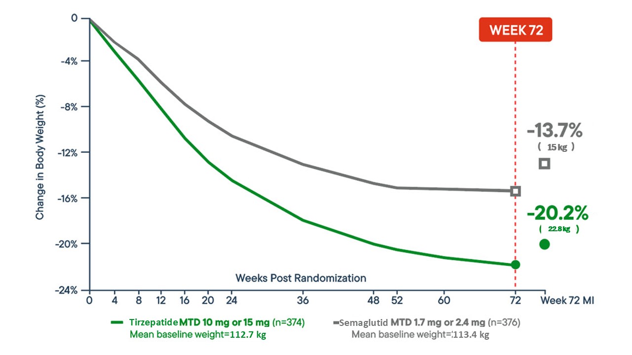 This head-to-head comparison highlights a greater overall body weight reduction with tirzepatide versus semaglutide over 72 weeks.